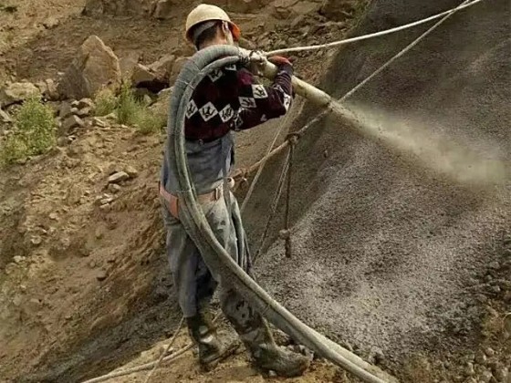 噴射護坡砼強度等級C10- C50。本工程采用干式噴射技術,噴射機型號為PZ-5B型噴射機。該機干噴能力為5~5.5M3/h,輸送距離水平可達200m,垂直為40M,電機功 率為7.5KW,空壓機工作電源為380V/75KW。砼噴射回彈率25~35%。