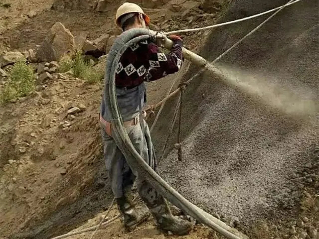 山體噴射護坡采用壓力機械將混凝土噴射到構件表面,以增大構件截面的施工工藝。包括鋼筋錨固、土釘、鋼筋綁扎、混凝土噴射等施工工序。 一、 噴射混凝土說明 噴射護坡砼強度等級C10- C50。本工程采用干式噴射技術,噴射機型號為PZ-5B型噴射機。該機干噴能力為5~5.5M3/h,輸送距離水平可達200m,垂直為40M,電機功 率為7.5KW,空壓機工作電源為380V/75KW。砼噴射回彈率25~35%。     標號C10 噴射用砼原材料。通常材料要求:不低于425#水泥,中砂(含水率控制在5%~7%),碎石粒徑小于15mm,水源水壓0.15~0.2MPa,外加劑(速凝劑,摻量符合設計要求)。施工配合比符合實驗配比規定。   二、適用范圍:      1、適用于梁、板、柱、墻加大截面,提高承載力,火災后構件修復,磚混結構中磚墻的加固 2、適用于基坑噴射護坡 3、適用于山體噴射護坡 4、適用于土山坡噴射護坡